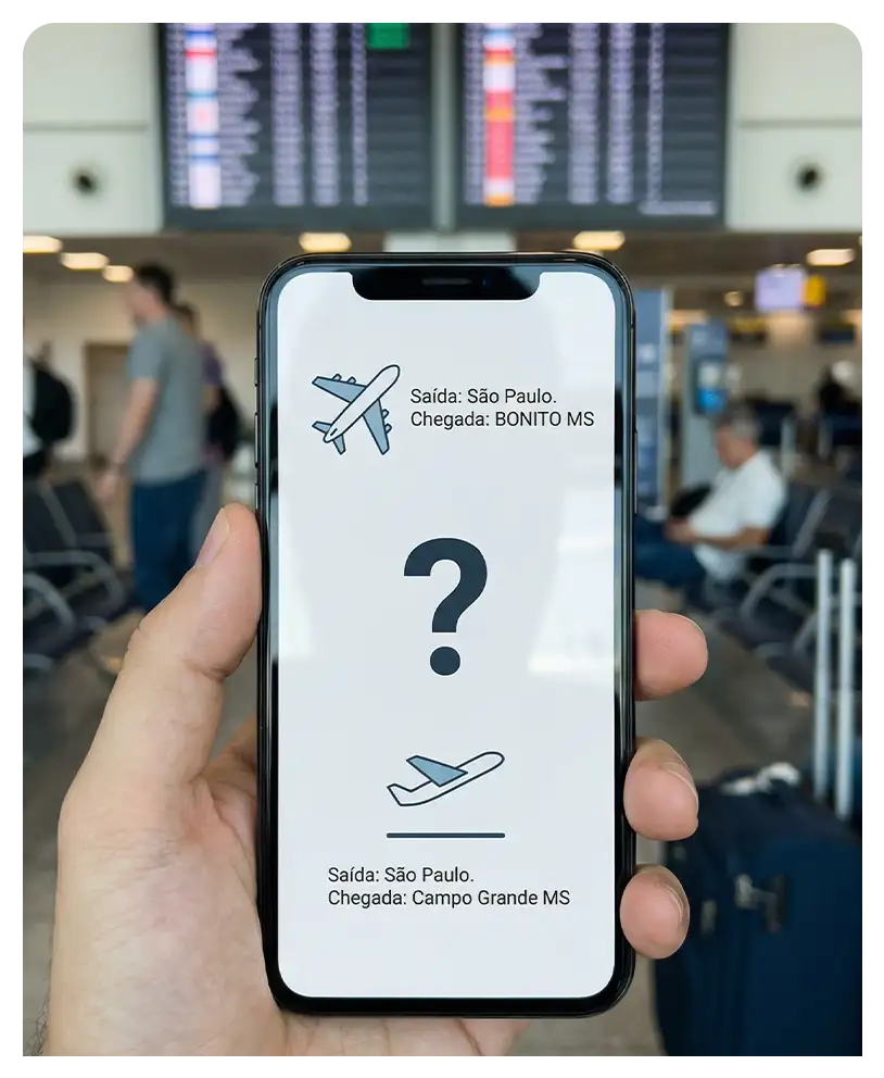 Este é o perrengue nº 1 de quem sai de SP. O Aeroporto de Bonito (BYO) está crescendo (foram 16,37% mais desembarques em 2024), mas organizar o aéreo com os transfers e os passeios ainda é um quebra-cabeça para quem não conhece a região.