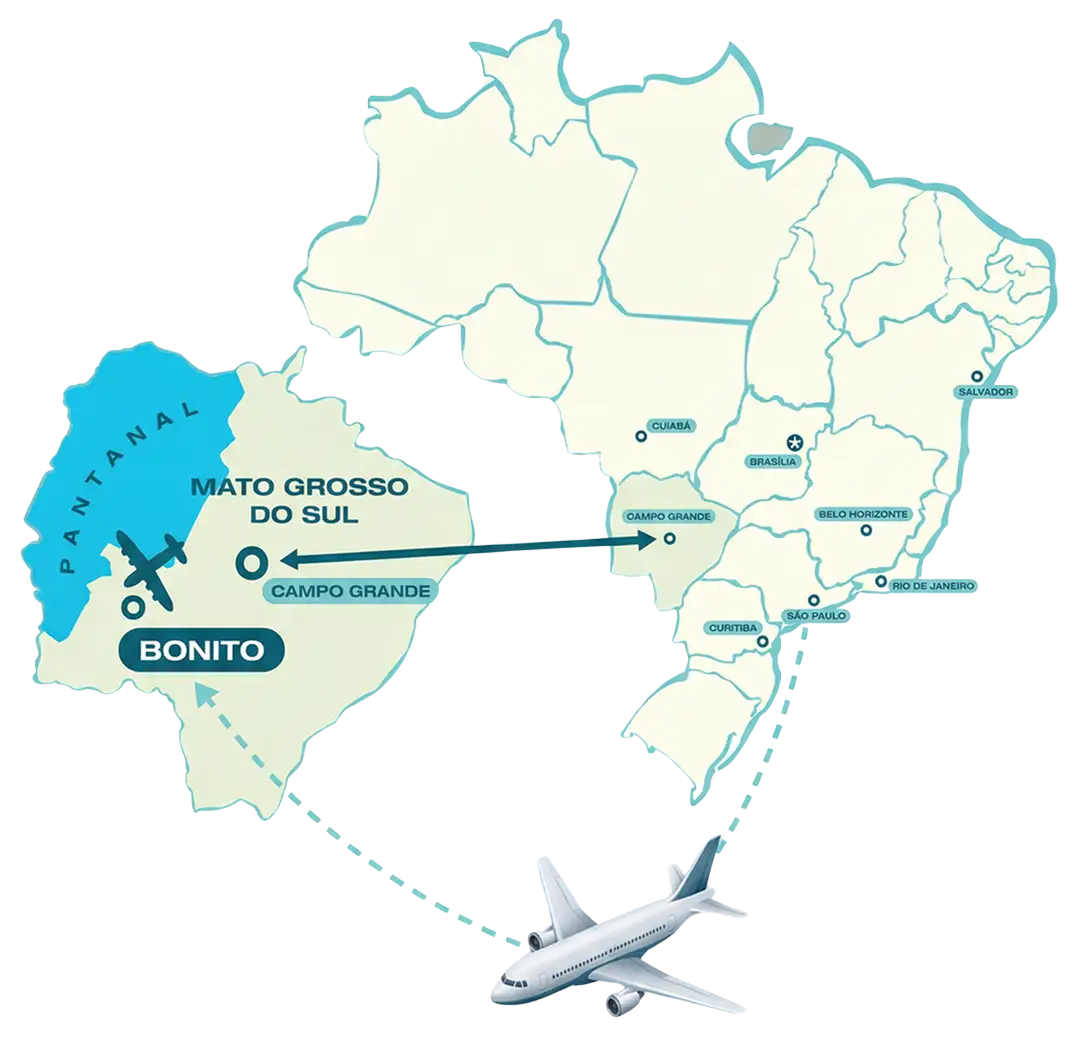 Você sabia que Bonito é a porta de entrada para o Pantanal Sul?. A apenas 135 km de distância (trecho Bonito-Miranda), a paisagem muda das águas transparentes para a maior planície inundável do planeta.